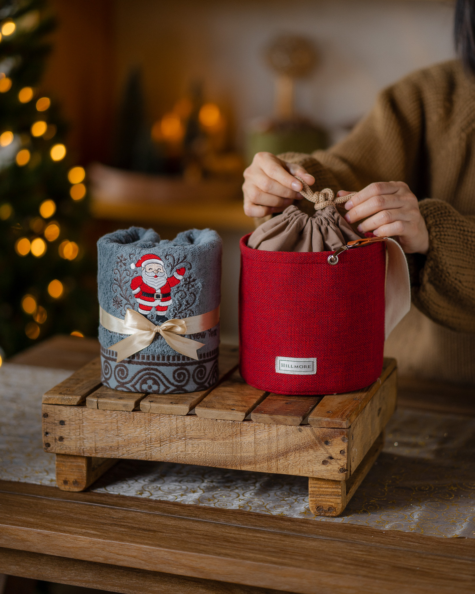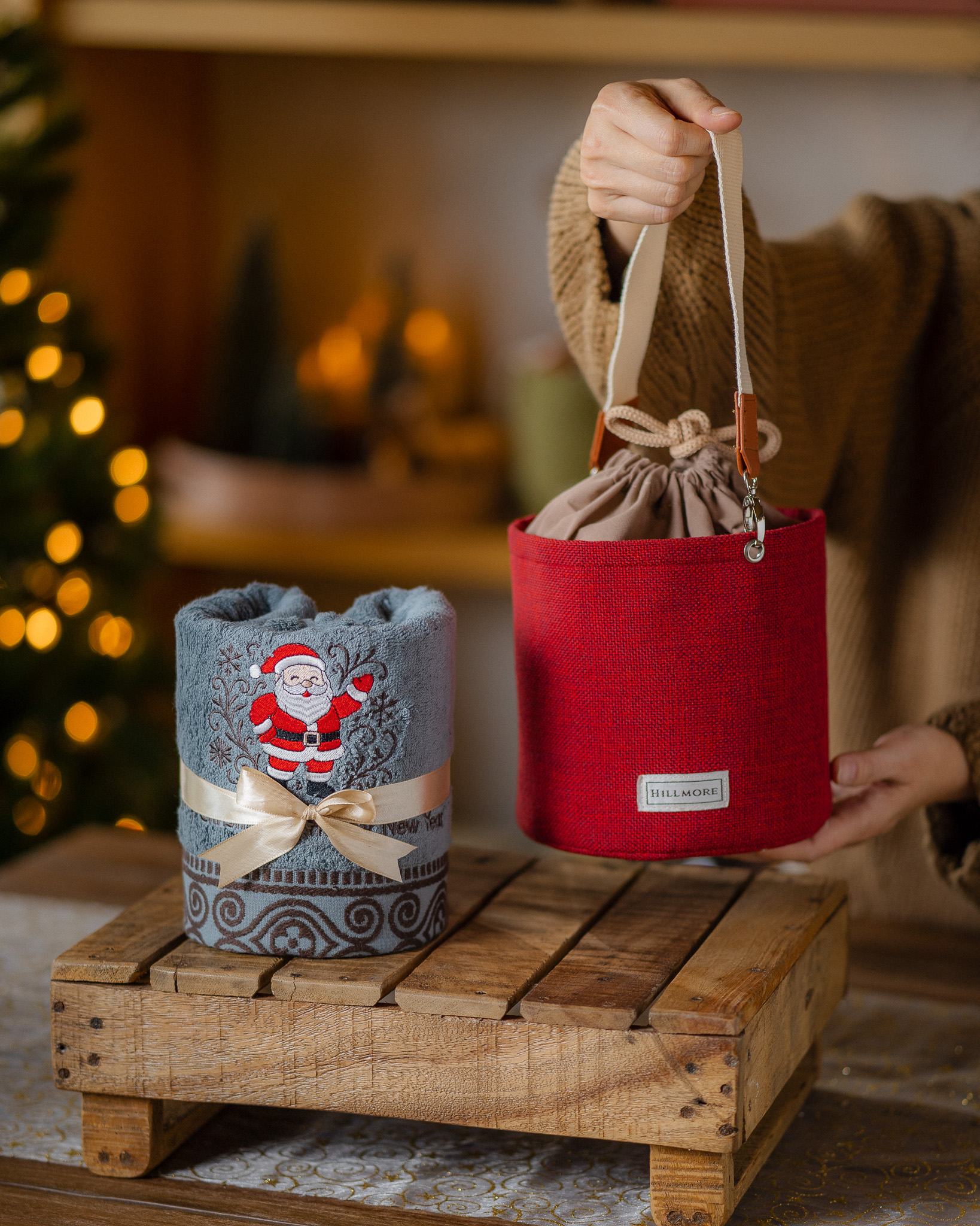 Each set includes one premium bath towel made from soft, absorbent natural cotton, detailed with exclusive Christmas embroidery, and elegantly placed inside a cute bucket bag that’s as functional as it is eye catching.