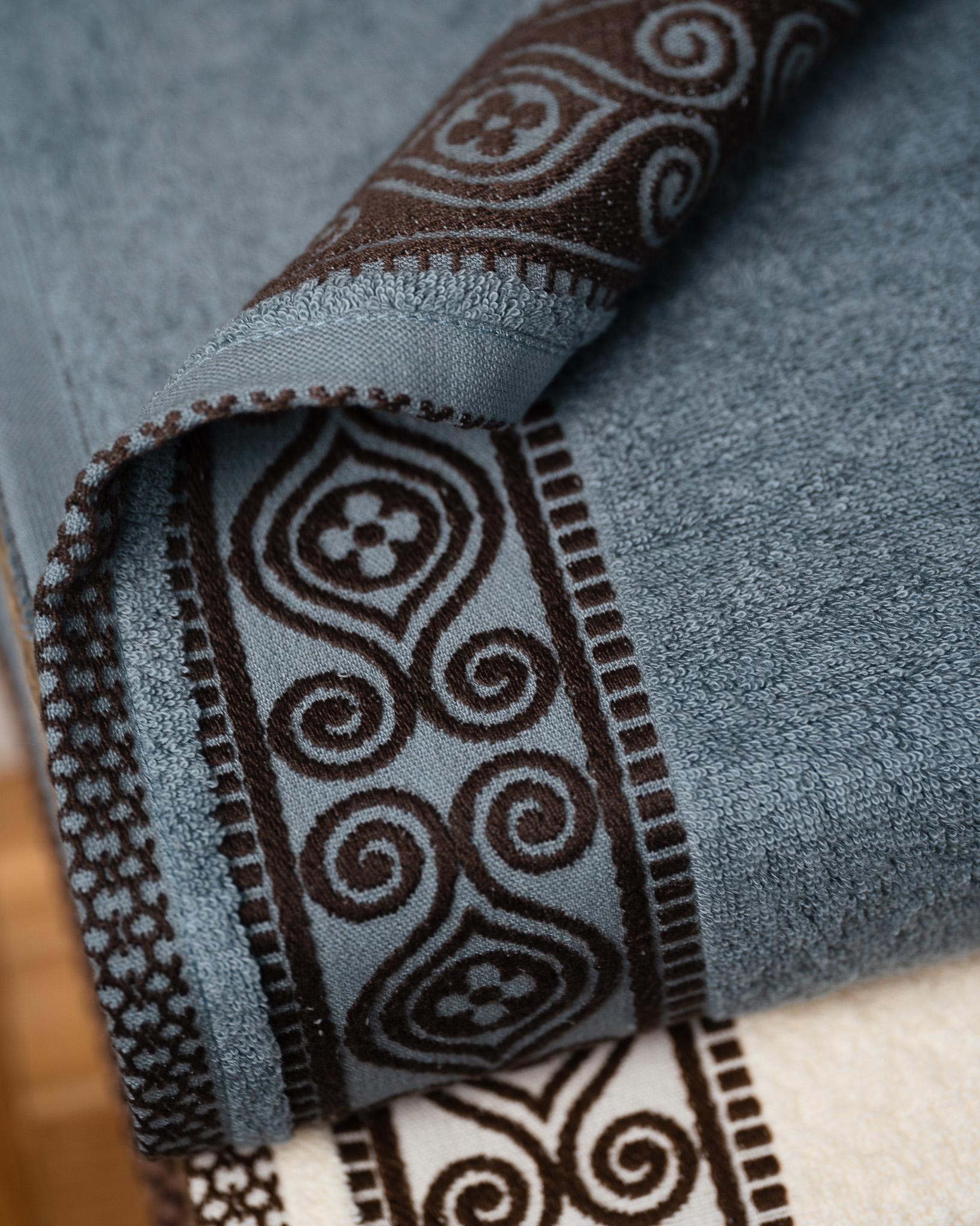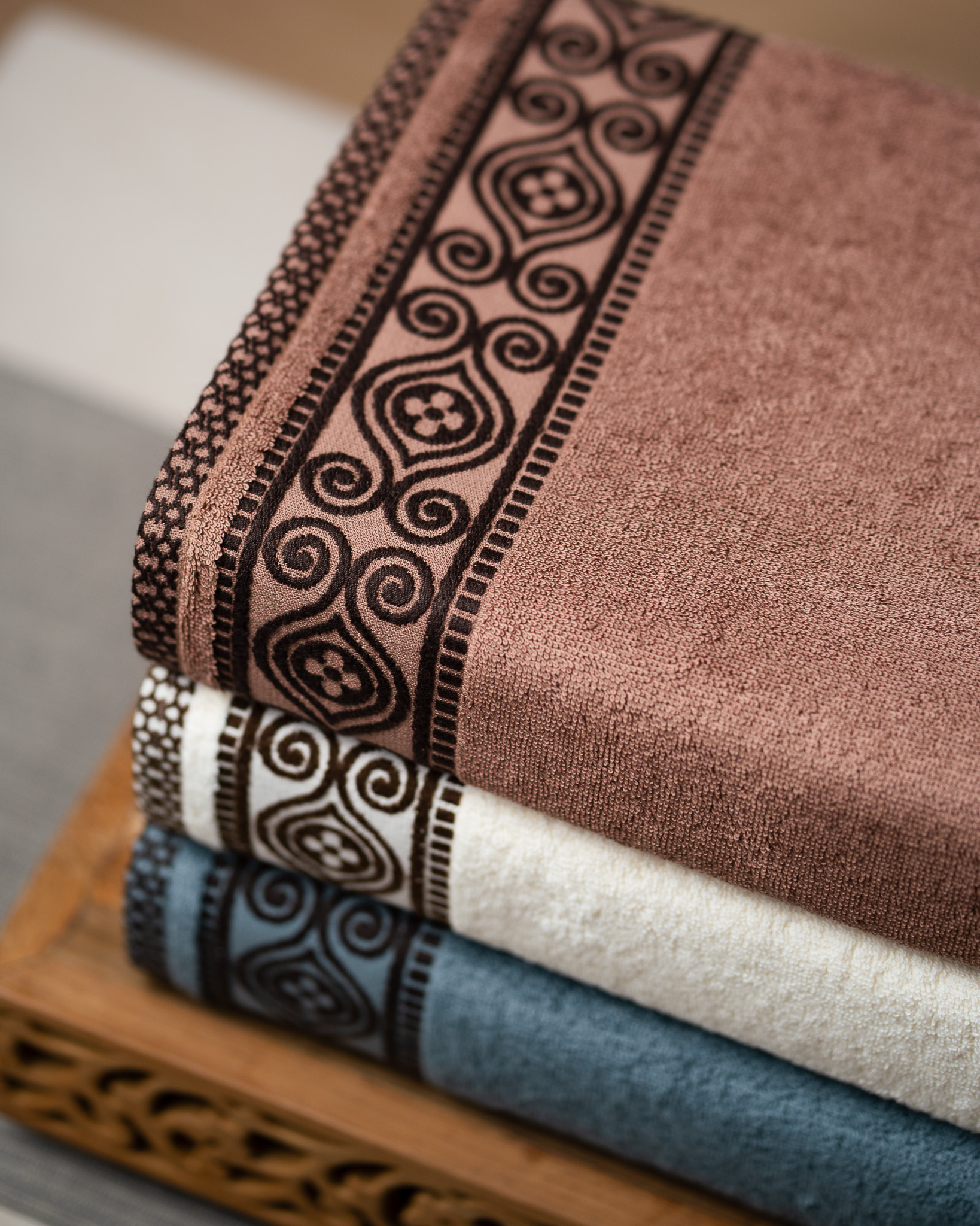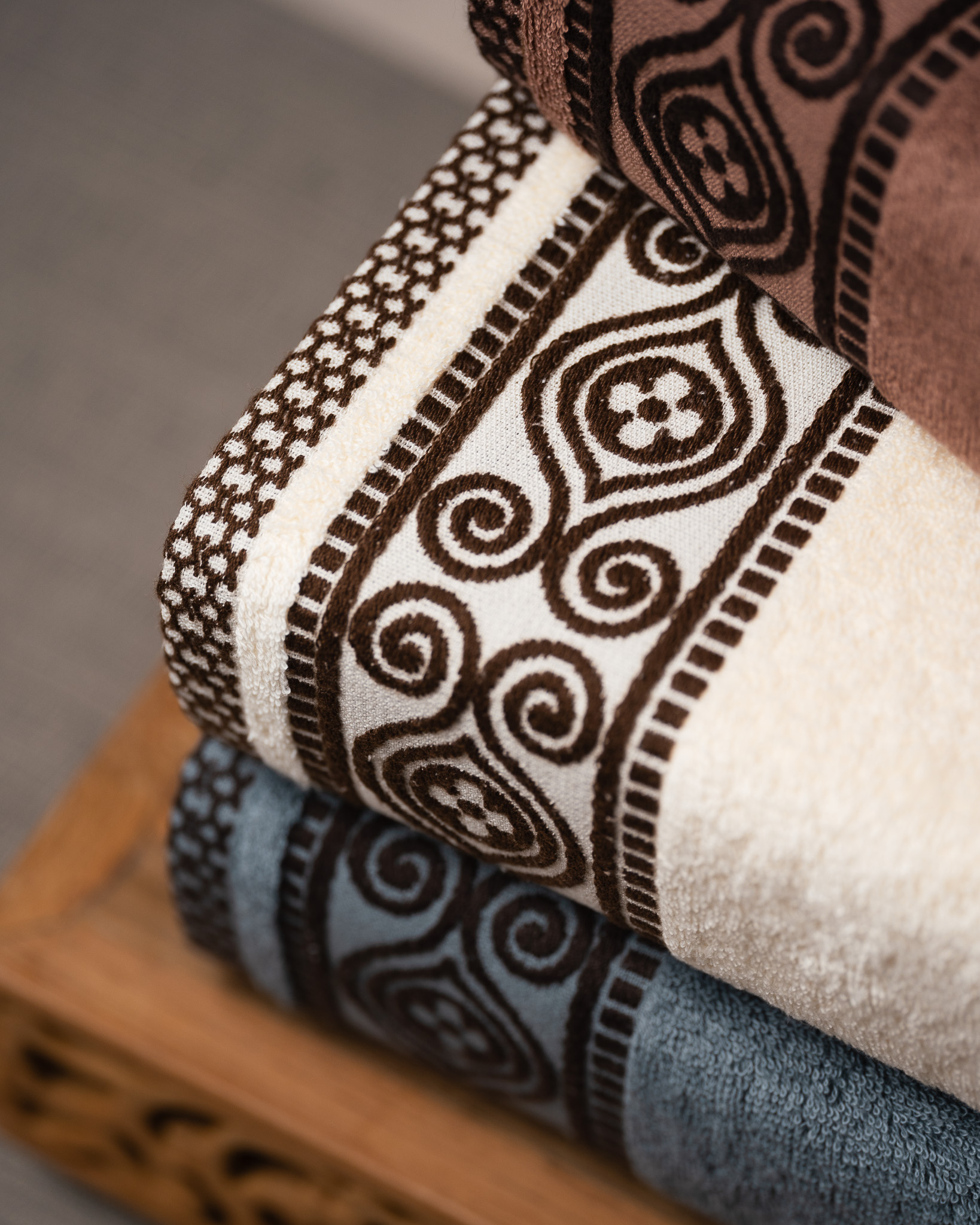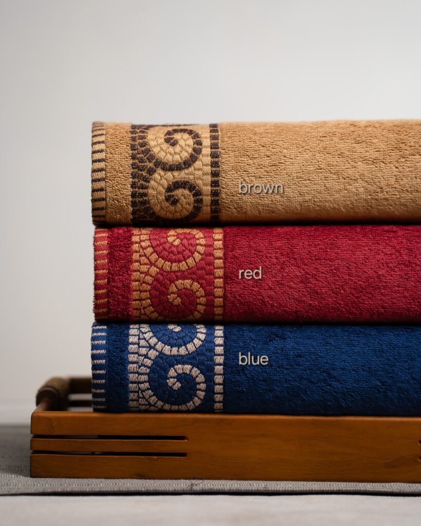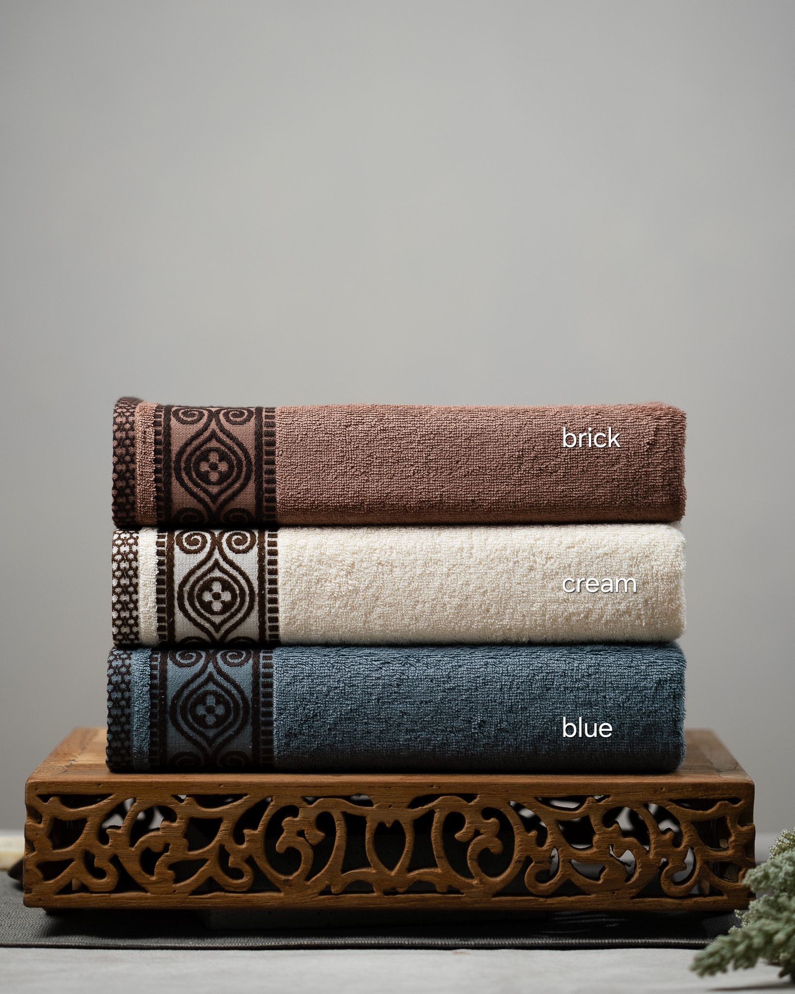 Menghadirkan sentuhan motif etnik klasik yang diberi nuansa modern, list handuk ini dihiasi pola spiral dan geometris yang terinspirasi dari ornamen tradisional. Detailnya tampak elegan dan timeless, berpadu serasi dengan warna-warna natural dan netral seperti brick, cream, dan blue yang mudah dipadukan.