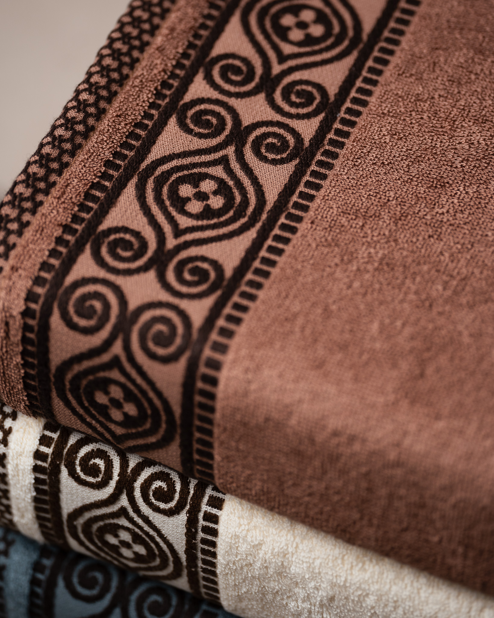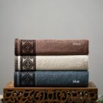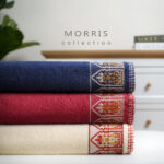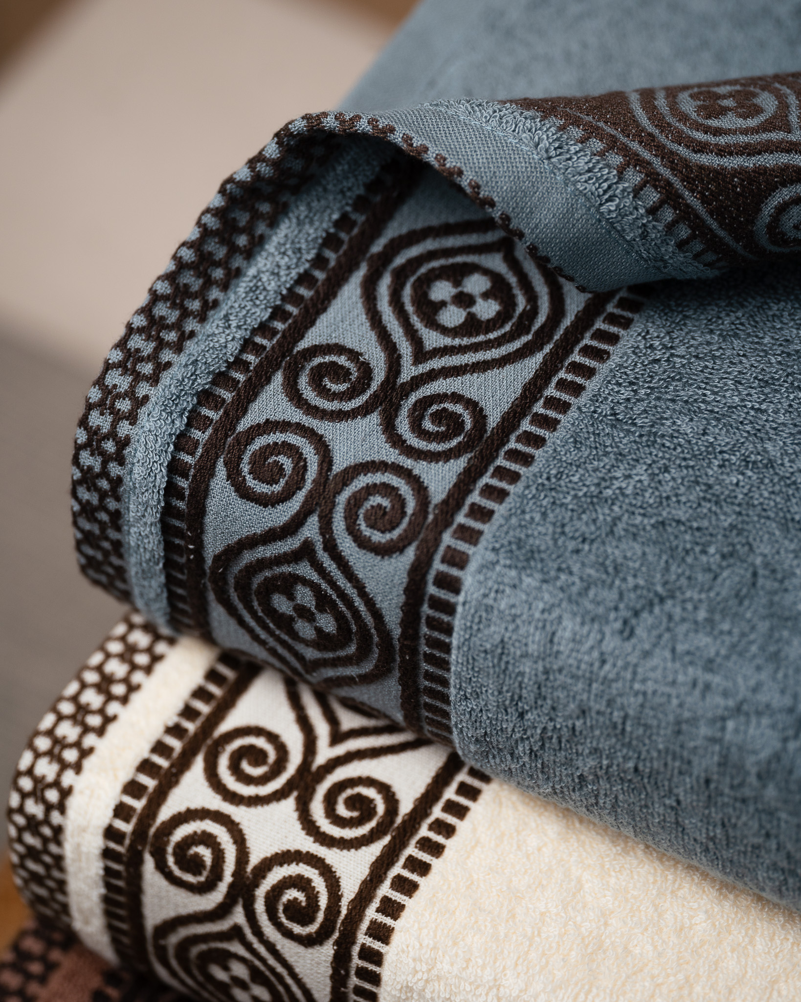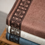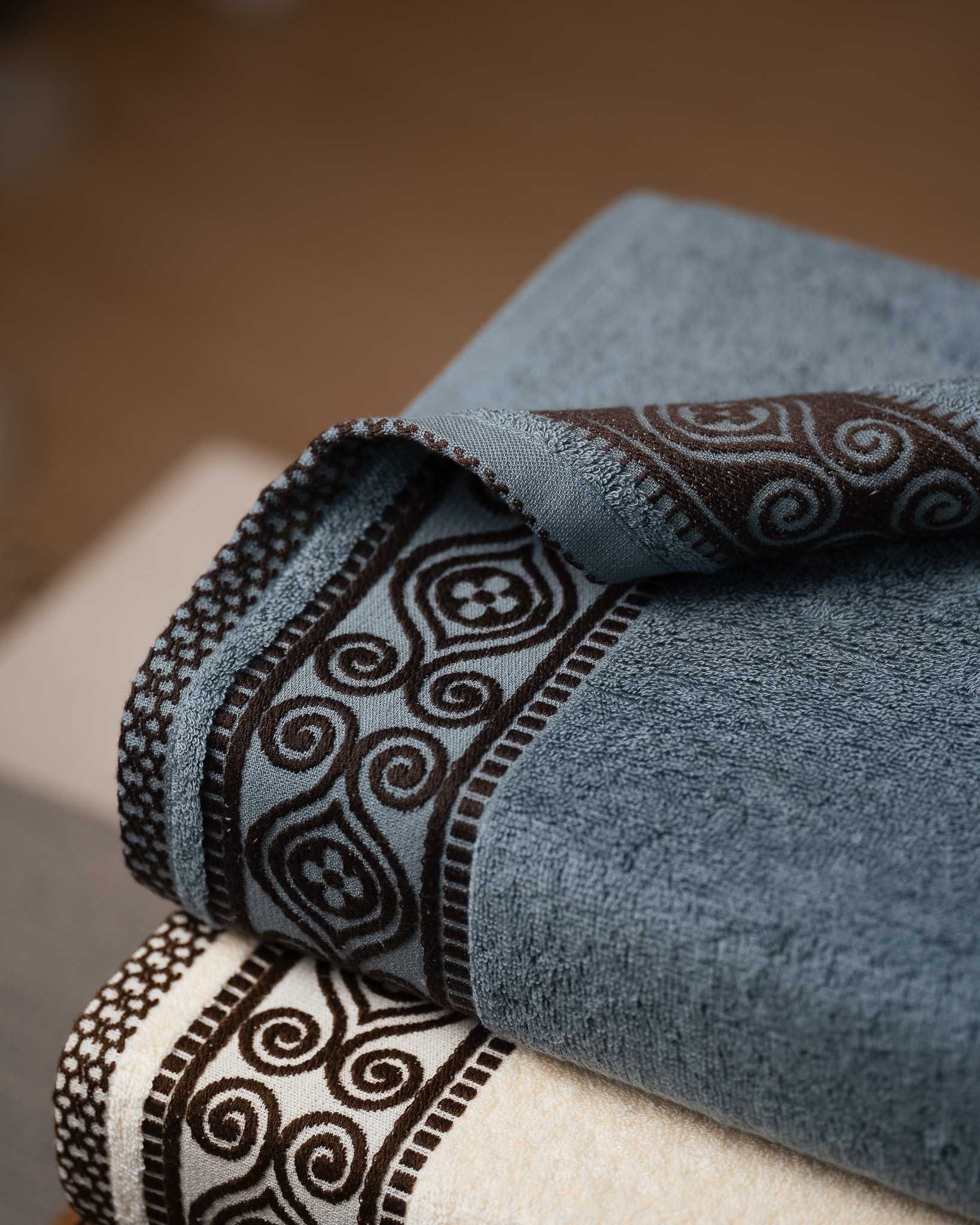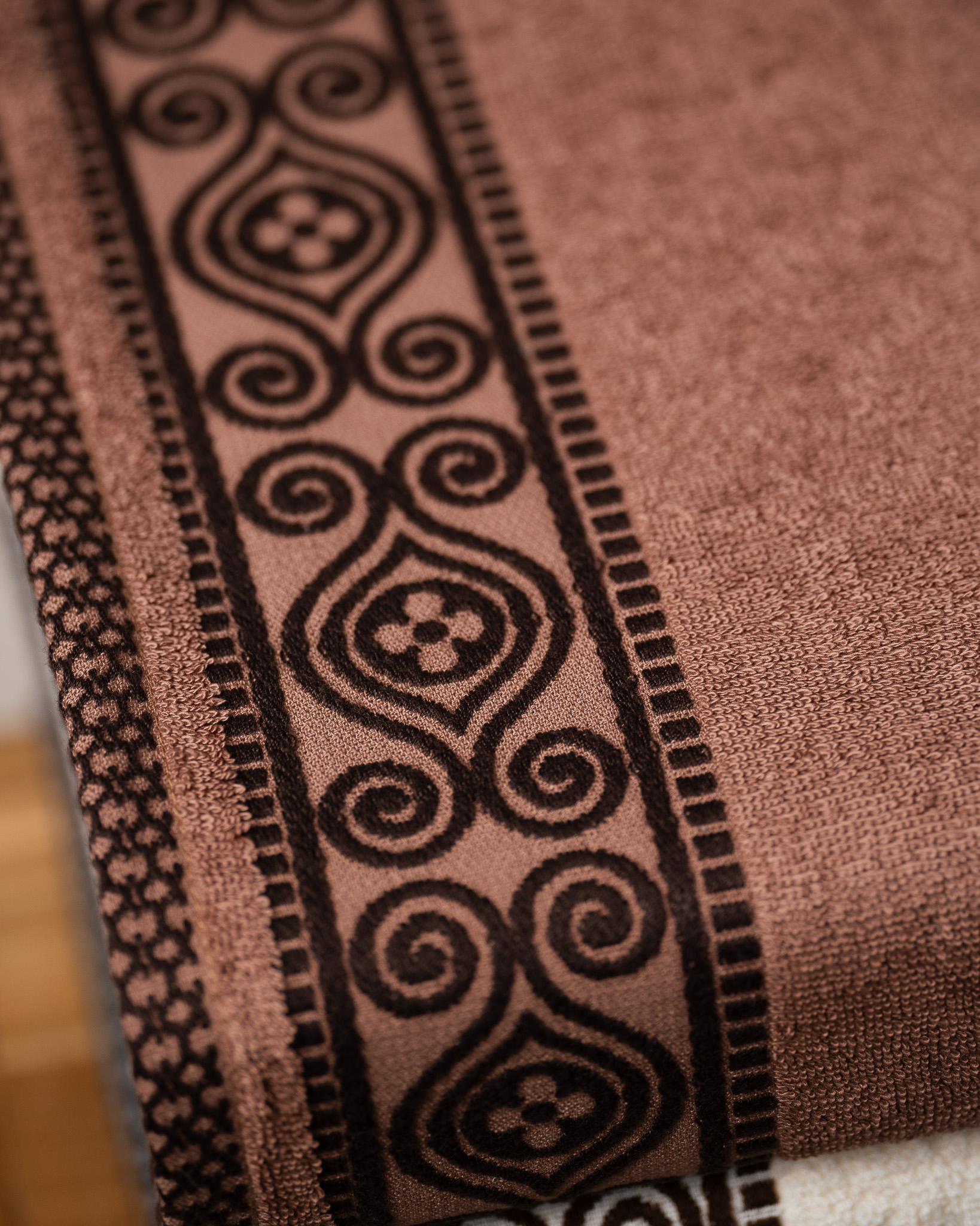 Menghadirkan sentuhan motif etnik klasik yang diberi nuansa modern, list handuk ini dihiasi pola spiral dan geometris yang terinspirasi dari ornamen tradisional. Detailnya tampak elegan dan timeless, berpadu serasi dengan warna-warna natural dan netral seperti brick, cream, dan blue yang mudah dipadukan.