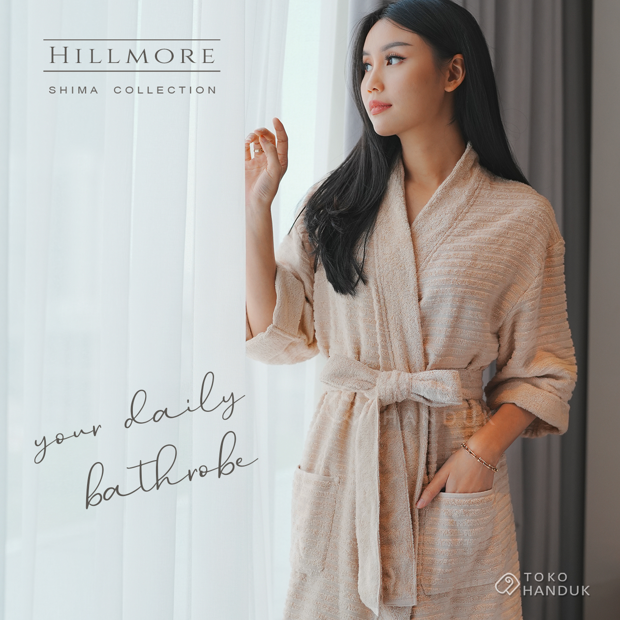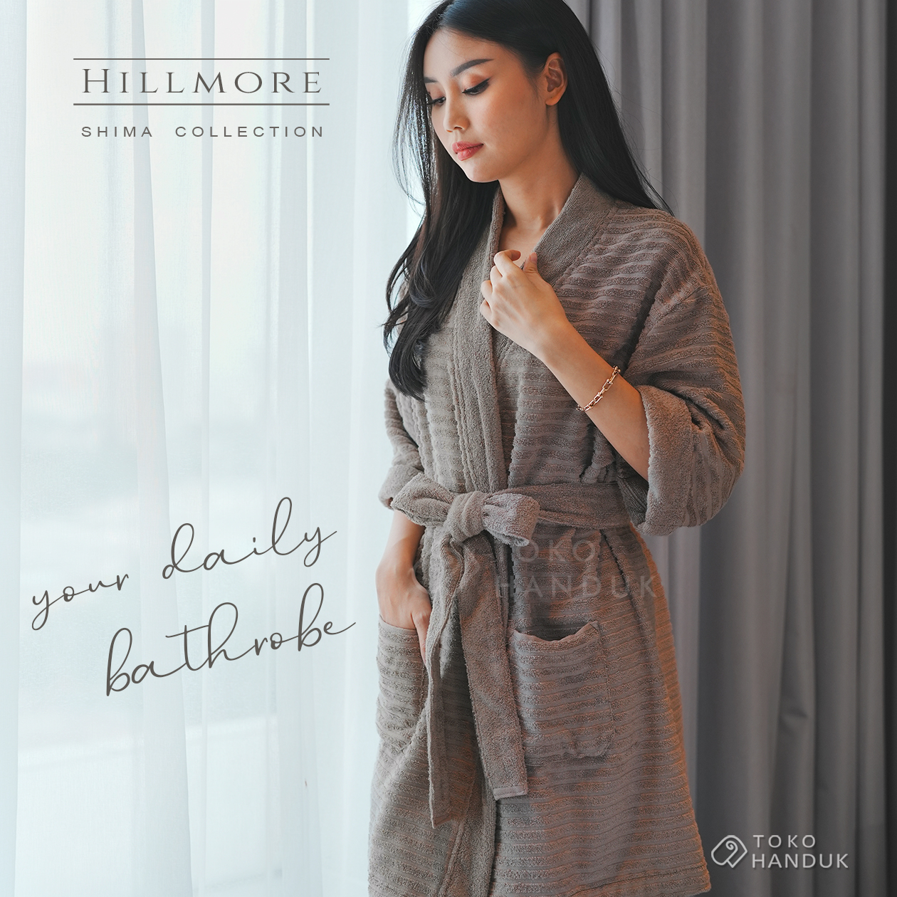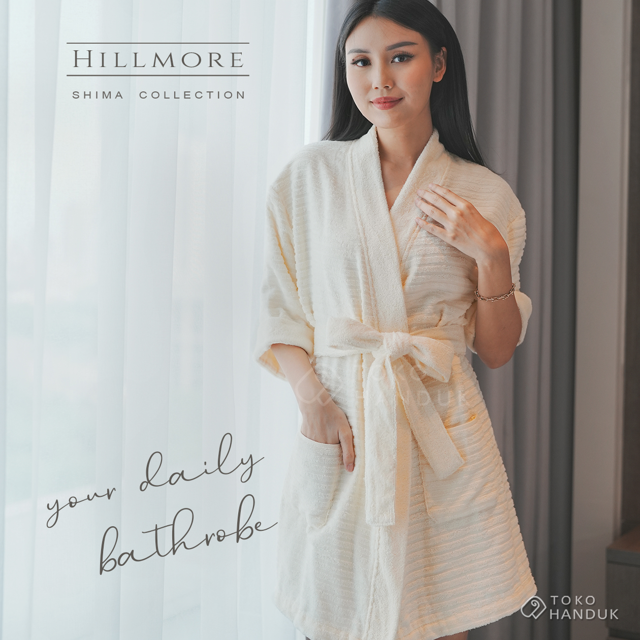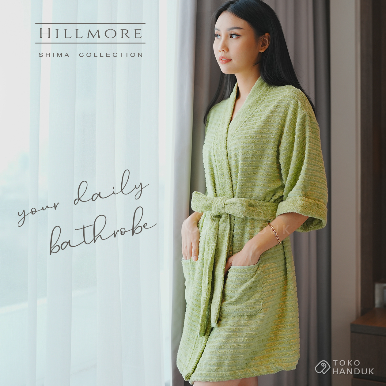 Bathrobe design Shima ini terbuat dari bahan TENCEL™️ Modal Cotton + antibacteria, yaitu bahan kain premium yang terbuat dari serat kayu (Lyocell). Bahan ini terkenal sangat fleksibel, cenderung lembut, dan ramah lingkungan. bathrobe Shima ini memiliki belt loop, tie ribbon, dan 2 kantong pada bagian depan.