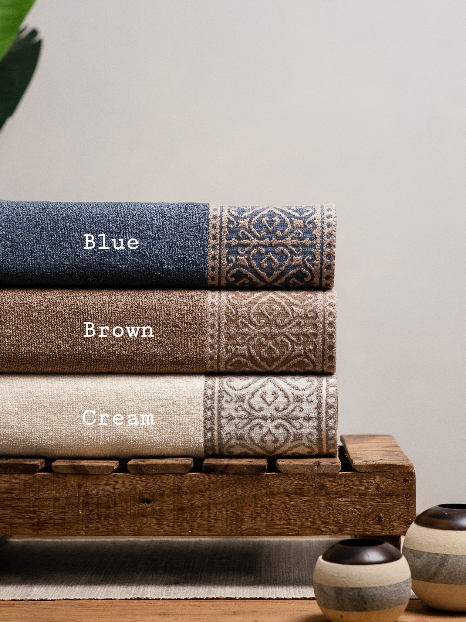 Handuk ini terbuat dari doubleyarn ( benang rangkap ) yang artinya terdiri dari 2 benang atau lebih tanpa di twist