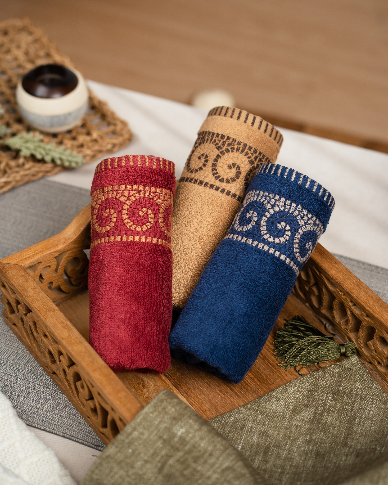 Motif swirl etnik pada list handuk Remus menghadirkan tampilan sporty yang tetap elegan. Dengan pilihan warna brown, red, dan blue, koleksi ini memancarkan energi, semangat, sekaligus gaya yang berkelas.